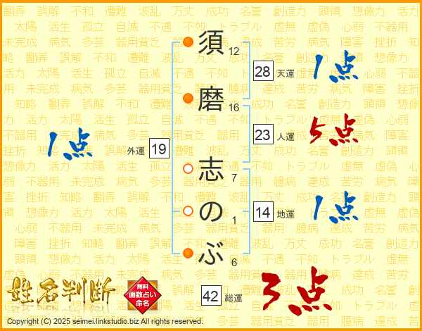須(12画)磨(16画) 志(7画)の(1画)ぶ(6画)