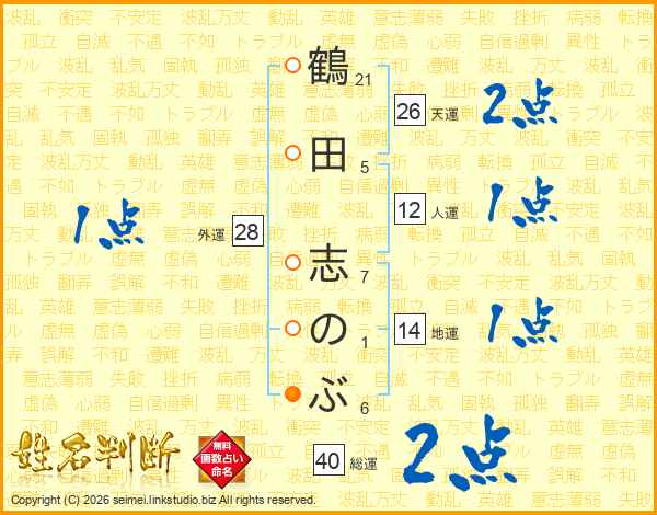 鶴田志のぶさんの天運は26画の2点!