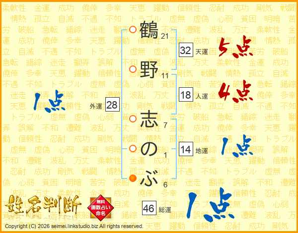 鶴(21画)野(11画) 志(7画)の(1画)ぶ(6画)