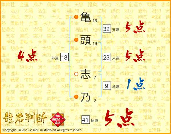亀(16画)頭(16画) 志(7画)乃(2画)