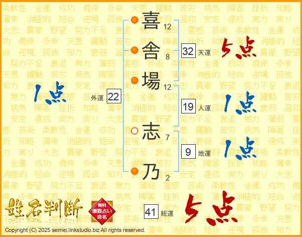 喜(12画)舎(8画)場(12画) 志(7画)乃(2画)