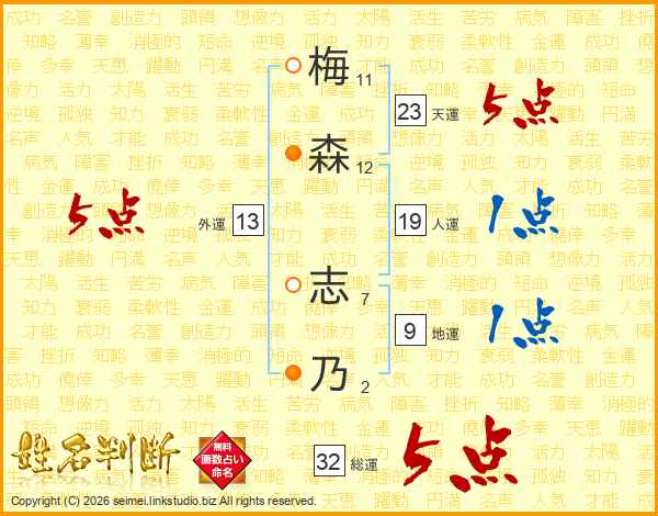 あなたの人生を表す1番重要な運勢です。生涯を通じて影響する総合運となり、主に50歳以降の晩年期に影響を及ぼします。苗字と名前の合計画数。