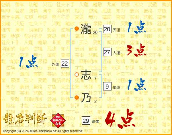 家系が持つ宿命的な運勢を表します。祖先から受け継いだ苗字ですので自分の力が及びません。家柄を象徴します。苗字の合計画数。