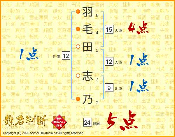 羽毛田志乃さんの総運は24画の5点!