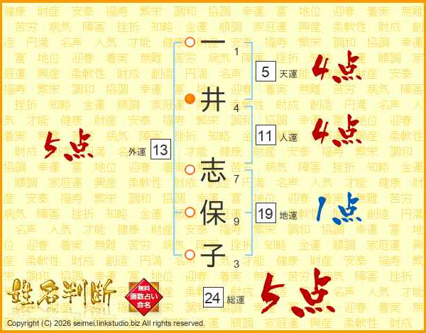 一(1画)井(4画) 志(7画)保(9画)子(3画)