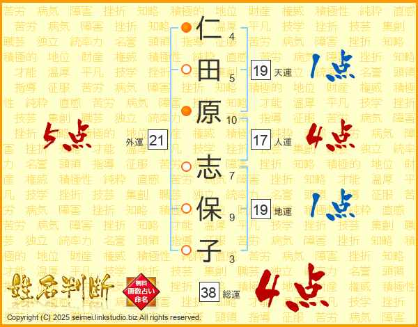 仁(4画)田(5画)原(10画) 志(7画)保(9画)子(3画)
