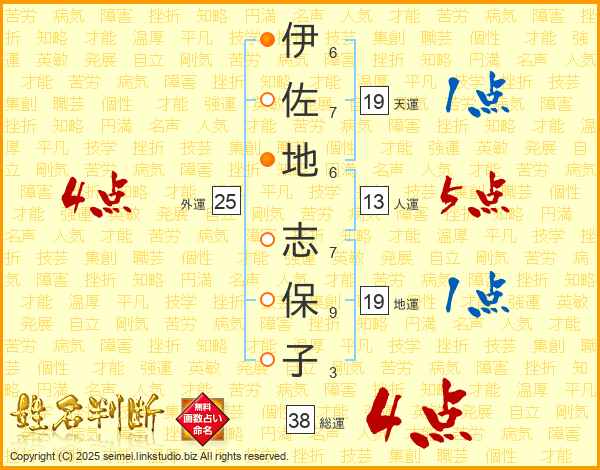 伊(6画)佐(7画)地(6画) 志(7画)保(9画)子(3画)