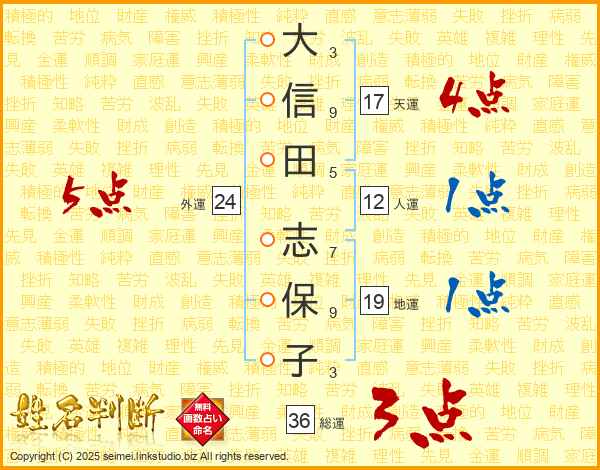 大(3画)信(9画)田(5画) 志(7画)保(9画)子(3画)