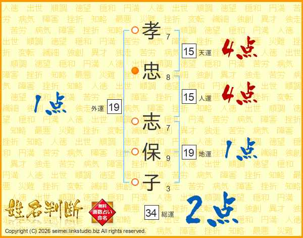 孝(7画)忠(8画) 志(7画)保(9画)子(3画)