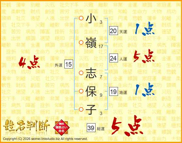 小(3画)嶺(17画) 志(7画)保(9画)子(3画)