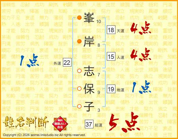 峯(10画)岸(8画) 志(7画)保(9画)子(3画)