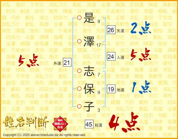 是(9画)澤(17画) 志(7画)保(9画)子(3画)