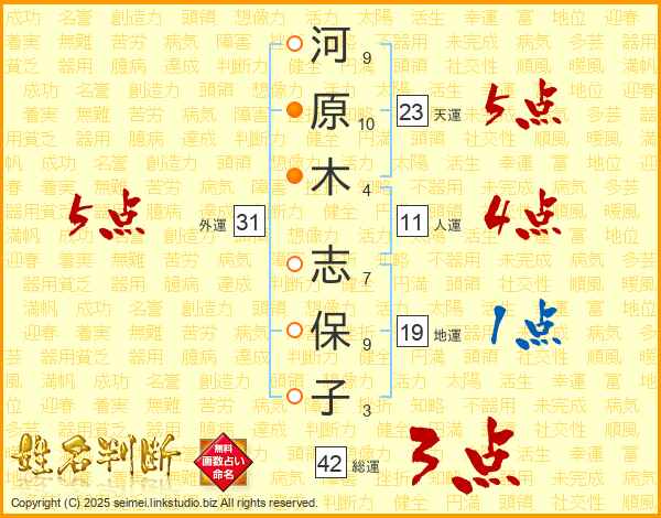 河(9画)原(10画)木(4画) 志(7画)保(9画)子(3画)