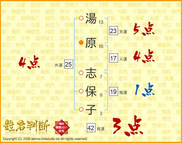 湯(13画)原(10画) 志(7画)保(9画)子(3画)