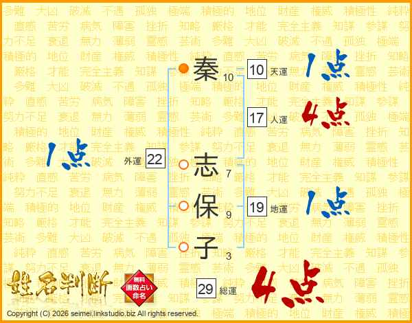 生活面を象徴する運勢です。外部から受ける影響力を表し、結婚運、家庭運や職場、環境への順応性を表します。総運から人運を引いた画数。姓や名が1文字の場合を除く。