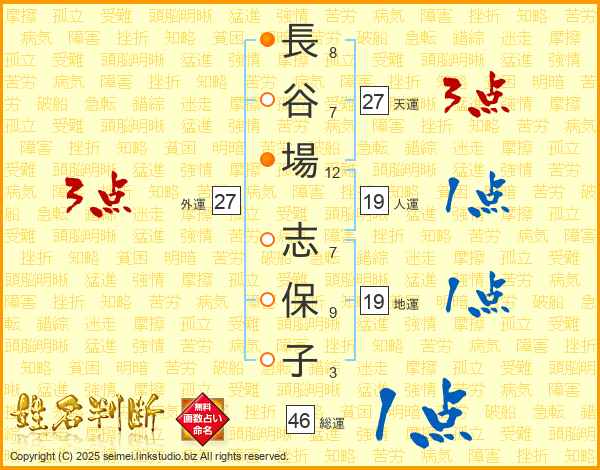 長(8画)谷(7画)場(12画) 志(7画)保(9画)子(3画)