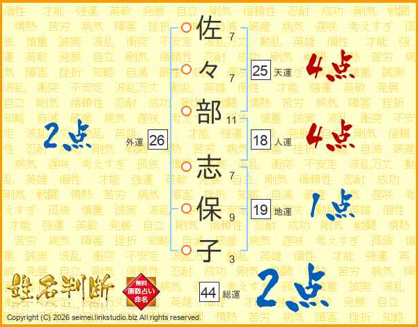 佐(7画)々(7画)部(11画) 志(7画)保(9画)子(3画)