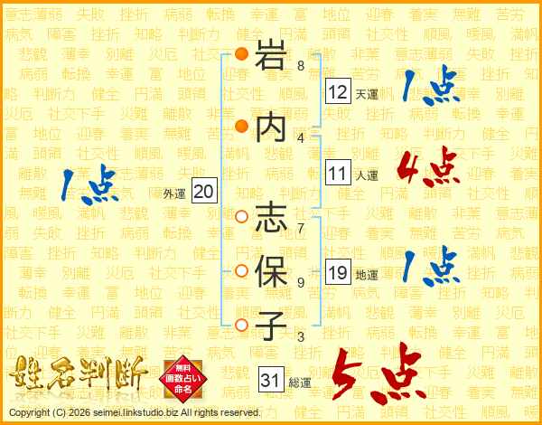 岩(8画)内(4画) 志(7画)保(9画)子(3画)