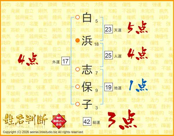 白(5画)浜(18画) 志(7画)保(9画)子(3画)