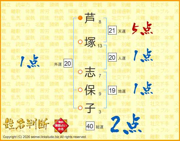 芦(8画)塚(13画) 志(7画)保(9画)子(3画)