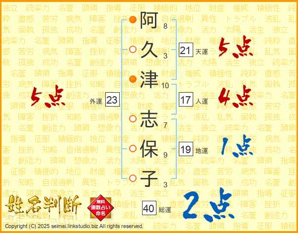 阿(8画)久(3画)津(10画) 志(7画)保(9画)子(3画)