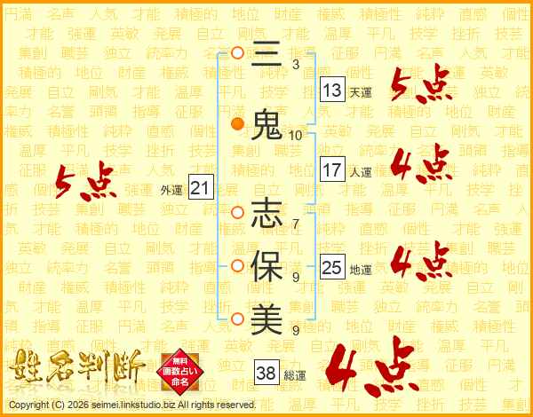 三鬼志保美さんの総運は38画の4点!