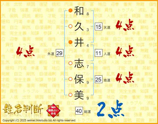 和(8画)久(3画)井(4画) 志(7画)保(9画)美(9画)