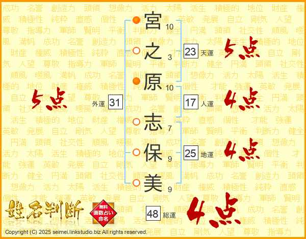 宮(10画)之(3画)原(10画) 志(7画)保(9画)美(9画)