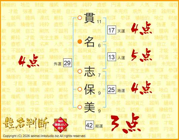 貫(11画)名(6画) 志(7画)保(9画)美(9画)