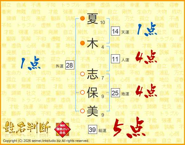 夏(10画)木(4画) 志(7画)保(9画)美(9画)