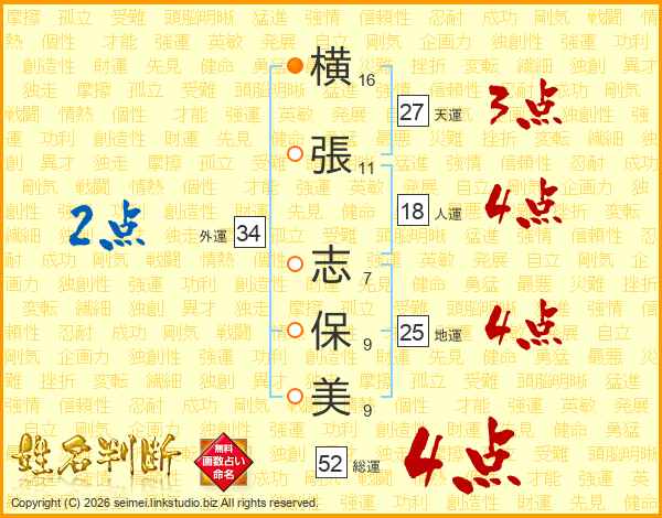 横(16画)張(11画) 志(7画)保(9画)美(9画)
