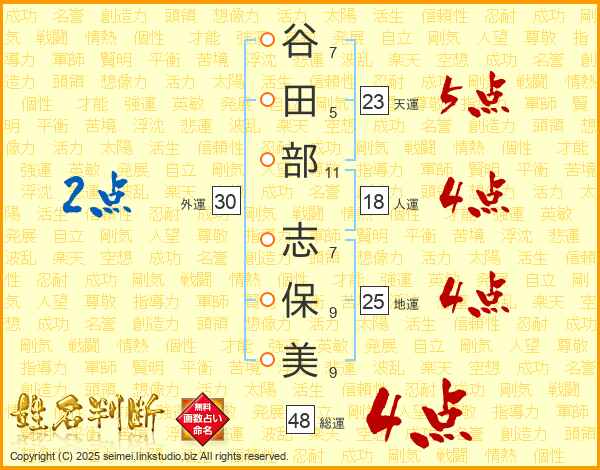 谷(7画)田(5画)部(11画) 志(7画)保(9画)美(9画)