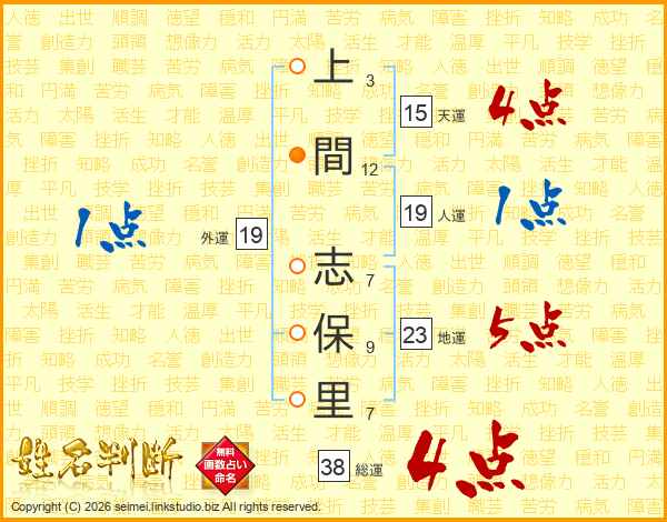 上(3画)間(12画) 志(7画)保(9画)里(7画)