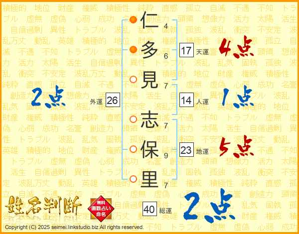 仁(4画)多(6画)見(7画) 志(7画)保(9画)里(7画)