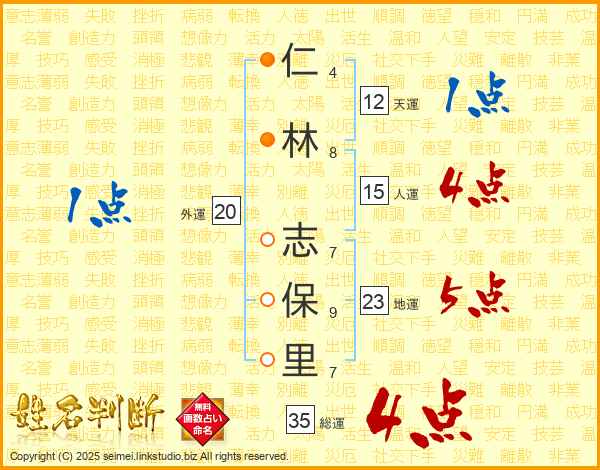 仁(4画)林(8画) 志(7画)保(9画)里(7画)