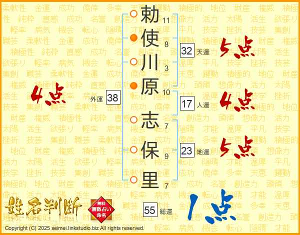 勅(11画)使(8画)川(3画)原(10画) 志(7画)保(9画)里(7画)