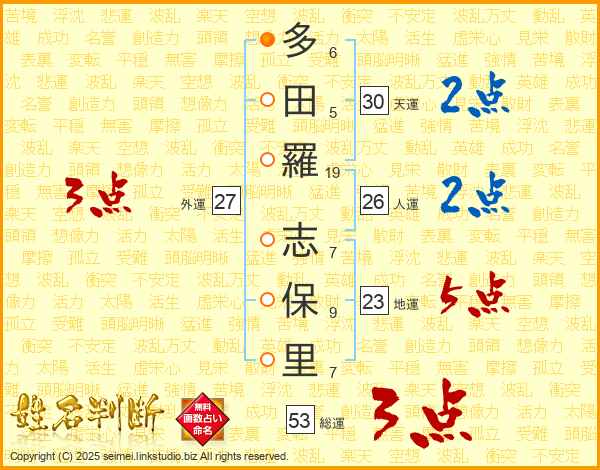 多(6画)田(5画)羅(19画) 志(7画)保(9画)里(7画)