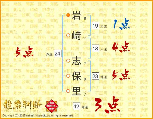 岩(8画)﨑(11画) 志(7画)保(9画)里(7画)