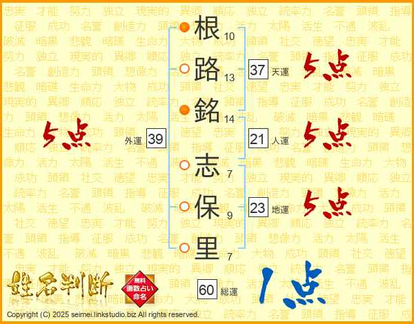 根(10画)路(13画)銘(14画) 志(7画)保(9画)里(7画)