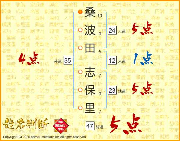 桑(10画)波(9画)田(5画) 志(7画)保(9画)里(7画)