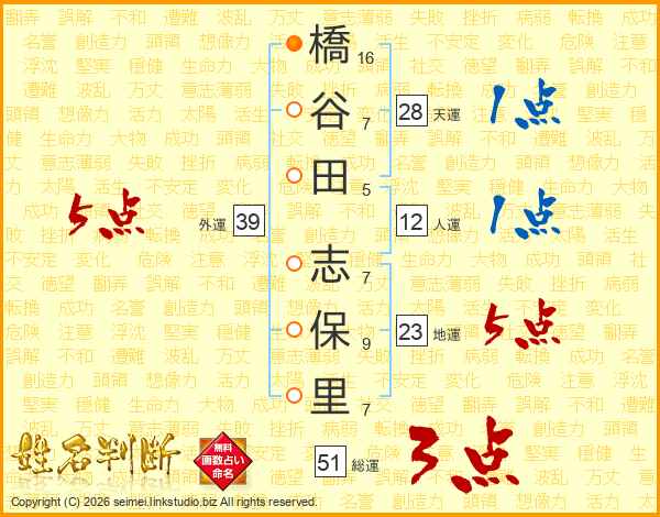 橋(16画)谷(7画)田(5画) 志(7画)保(9画)里(7画)