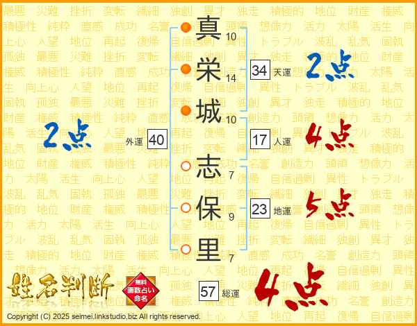 真(10画)栄(14画)城(10画) 志(7画)保(9画)里(7画)