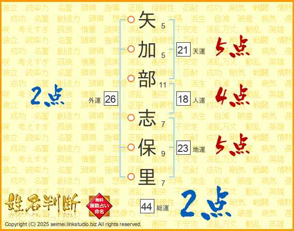 矢(5画)加(5画)部(11画) 志(7画)保(9画)里(7画)