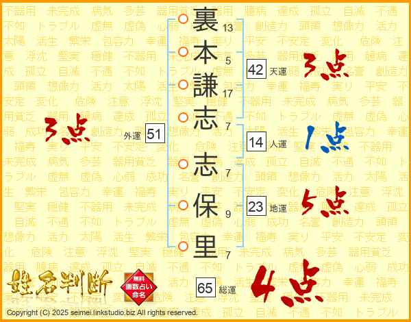 裏(13画)本(5画)謙(17画)志(7画) 志(7画)保(9画)里(7画)