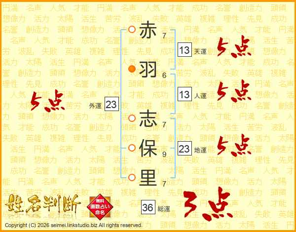 赤(7画)羽(6画) 志(7画)保(9画)里(7画)