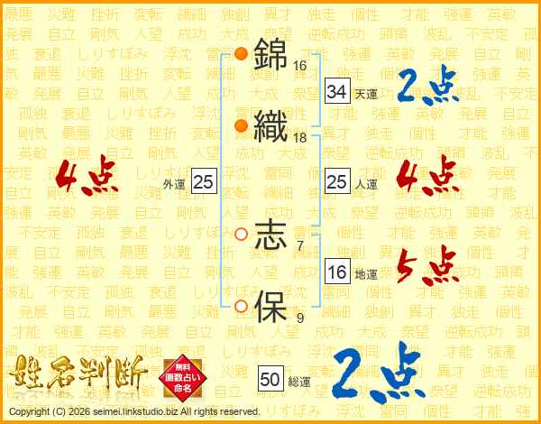 生活面を象徴する運勢です。外部から受ける影響力を表し、結婚運、家庭運や職場、環境への順応性を表します。総運から人運を引いた画数。姓や名が1文字の場合を除く。