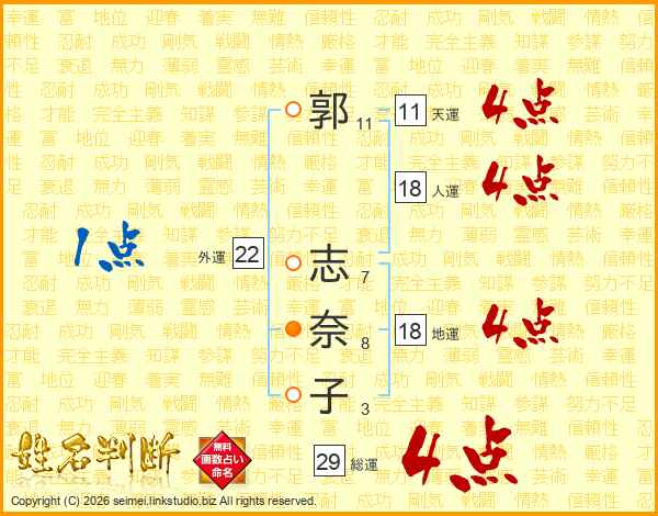 生活面を象徴する運勢です。外部から受ける影響力を表し、結婚運、家庭運や職場、環境への順応性を表します。総運から人運を引いた画数。姓や名が1文字の場合を除く。