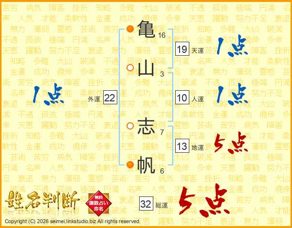亀(16画)山(3画) 志(7画)帆(6画)