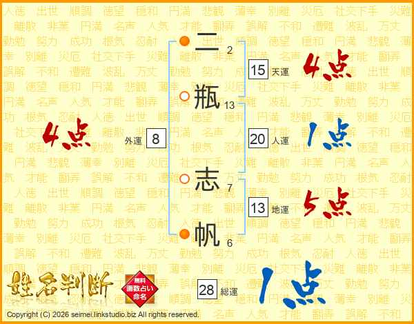 生活面を象徴する運勢です。外部から受ける影響力を表し、結婚運、家庭運や職場、環境への順応性を表します。総運から人運を引いた画数。姓や名が1文字の場合を除く。