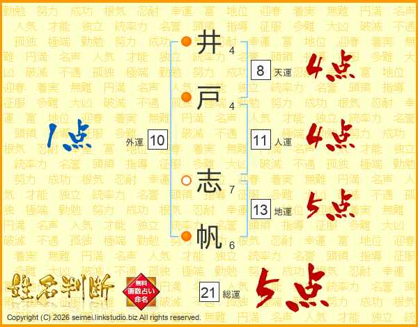 生活面を象徴する運勢です。外部から受ける影響力を表し、結婚運、家庭運や職場、環境への順応性を表します。総運から人運を引いた画数。姓や名が1文字の場合を除く。